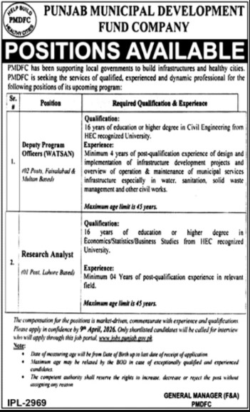 Experience: Minimum 4 years of post-qualification experience in the design and implementation of infrastructure development projects, and an overview of the operation & maintenance of municipal services infrastructure, especially in water. Sanitation, solid waste management, and other civil works, and more experienced candidates should apply before 09 April 2026.